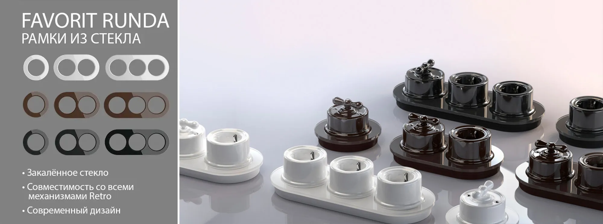 Серия ретро-рамок Werkel дополнена стильными стеклянными моделями Favorit Runda. Рамки выполнены из высококачественного закаленного стекла, которое не боится появления царапин и трещин. Декоративные рамки из стекла долгое время сохраняют свой первоначальный вид и износостойкие свойства. Рамки представлены в одно-, двух- и трехпостовом исполнении и универсальных цветах: белом, коричневом и черном. Новые ретро-рамки идеально подходят для помещений, исполненных в модных стилях лофт, винтаж и прованс. Универсальные стеклянные ретро-рамки Werkel можно использовать с механизмами других производителей.